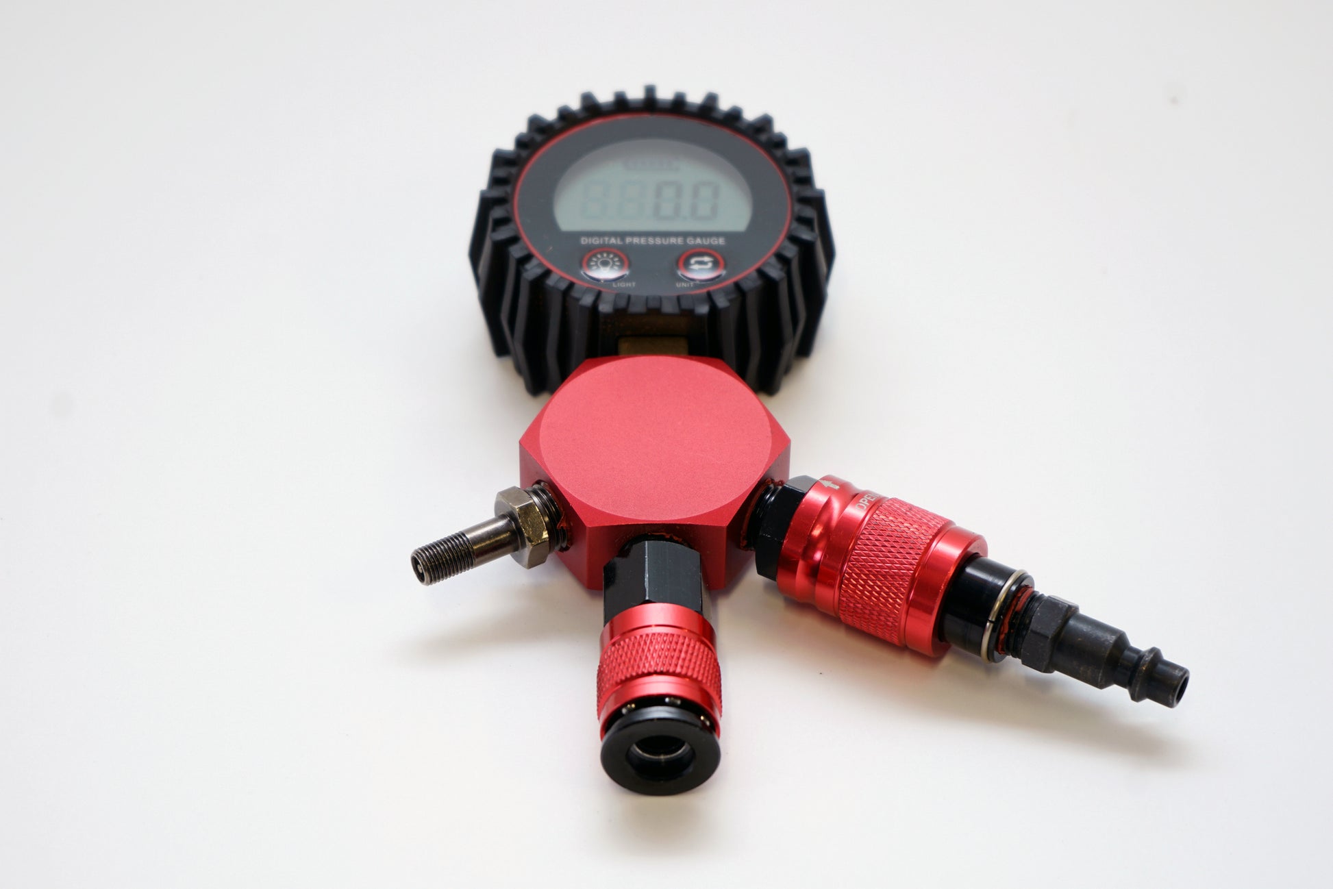 A standard ¼” compressor attachment as well as a Shrader connection to connect either a portable 12 volt compressor or a larger commercial compressor.
