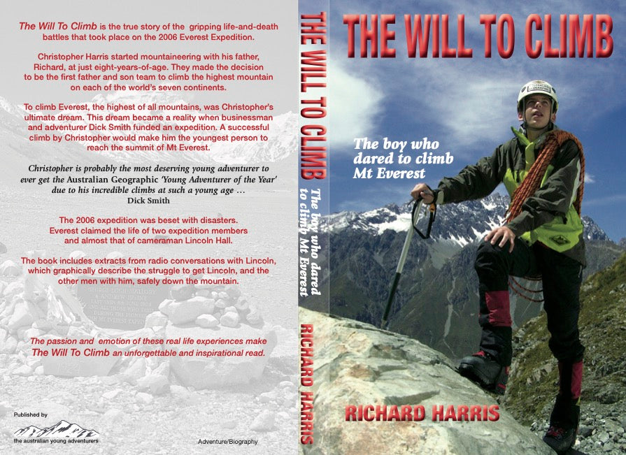The Will To Climb is the true story of Australian boy Christopher Harris, who along with his father Richard had a dream to climb the highest mountain on each of the seven continents of the world, including Mt Everest. The book recounts their first expedition and all the others that lead up to Christopher's attempt to become the youngest person at just 15 to climb Mt Everest.