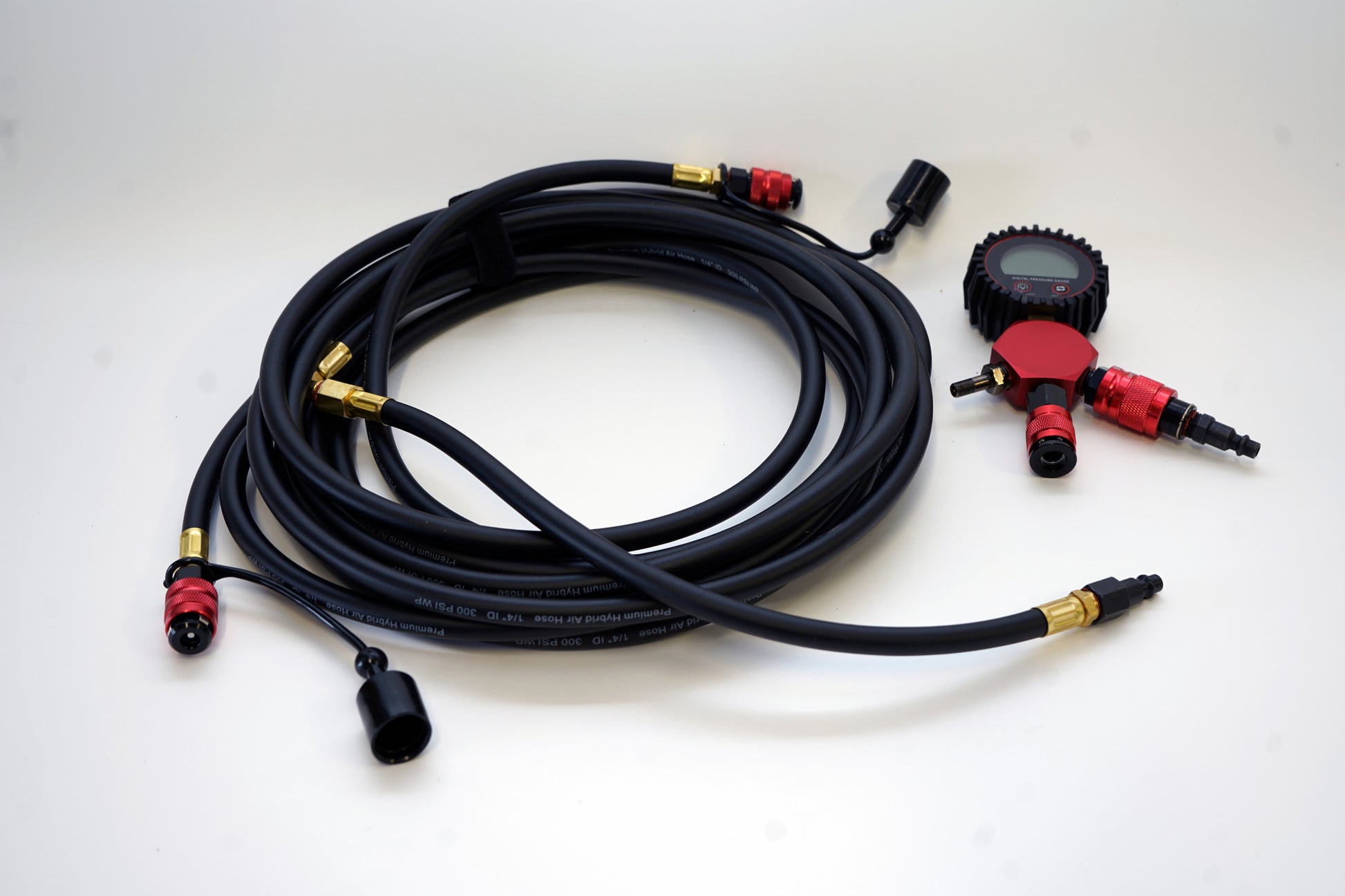 A standard ¼” compressor attachment as well as a Shrader connection to connect either a portable 12 volt compressor or a larger commercial compressor.